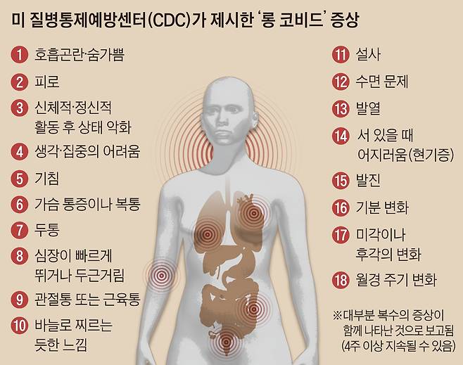 A. 피로와 숨가쁨, ‘브레인 포그’(머리에 안개가 낀 것처럼 사고나 집중이 어려운 증상) 등이 대표적이다. 미 질병통제예방센터(CDC)는 18가지 증상<표 참조>을 제시하고 있는데 심장 두근거림, 신체·정신 활동 후 무력감, 복통, 두통, 관절 및 근육통, 설사, 현기증, 불면증, 미각·후각 변화 등도 포함됐다. 롱 코비드를 겪는 사람들에게는 대부분 두 가지 이상 증상의 조합이 함께 나타난다.