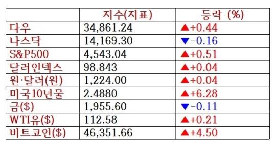 이날 뉴욕증권거래소(NYSE)에서 다우존스30산업평균지수는 전장보다 153.30포인트(0.44%) 상승한 3만4861.24에 마감했다. 대형주 위주의 스탠더드앤드푸어스(S&P)500지수는 22.90포인트(0.51%) 오른 4543.06, 기술주 중심의 나스닥 종합지수는 22.54포인트(0.16%) 하락한 1만4169.30으로 거래를 마쳤다.