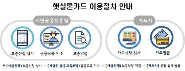 신청방법 자체는 어렵지 않습니다. 서민금융진흥원에 보증신청을 한 다음 심사를 거쳐 보증약정을 체결하면, 7개 협약카드사 중 1곳을 선택해 카드발급을 신청하면 됩니다.