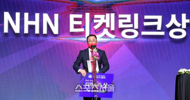 BNK 썸 정상호 사무국장이 28일 서울 영등포구 63컨벤션센터에서 열린 2021~2022 여자프로농구 정규리그 시상식에서 NHN 티켓링크상을 수상한 후 소감을 밝히고 있다.