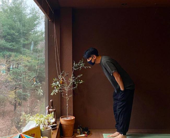 사진 속 김도균은 요가 매트 위에서 포즈를 취하고 있다. 김도균은 반소매에 티셔츠에 트레이닝 바지의 편안한 차림이다. 요가 스튜디오의 창문 너머로는 자연 경관이 보였다.