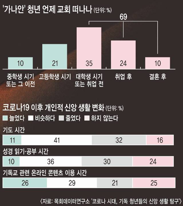 목회데이터연구소(대표 지용근)가 전국 크리스천 청년(19~39세) 700명을 대상으로 조사한 ‘코로나 시대, 기독 청년들의 신앙생활 탐구’(2020년 1월)에 따르면 10명 중 7명(69%)이 고등학교 졸업 후 ‘가나안 성도(기독 신앙이 있지만 교회에 출석하지 않는 성도)’가 되는 것으로 나타났다. 전도가 위축된 시대에 부모의 손에 이끌려 신앙생활을 지속해 온 성도들이 청소년기(12~18세)를 지나며 급격하게 교회 밖으로 이탈하게 된다는 분석이 나온다.