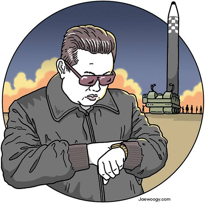 지난 주말 유튜브의 화제는 단연 김정은 국무위원장이 등장하는 북한의 대륙간탄도미사일(ICBM) 발사 영상이었다. 첫 장면부터 예사롭지 않았다. 격납고가 열리자 항공 점퍼를 입은 김정은 위원장이 군복 차림의 두 사내를 거느린 채 천천히 걸어 나오는 장면은 히틀러의 전당대회장 입장 신을 떠올리게 했다.