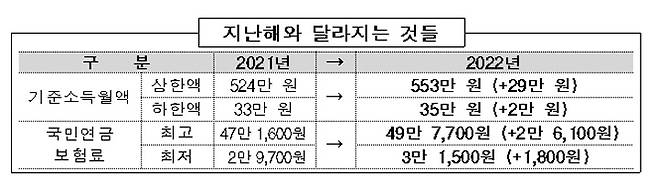 보건복지부(장관 권덕철)는 2022년 7월 1일부터 국민연금 보험료의 산정 기준인 기준소득월액 상한액이 553만 원, 하한액은 35만 원으로 상향 조정된다고 밝혔다.