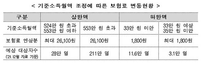 * 상한액에 해당하는 가입자 239만 명의 월 보험료는 최대 26,100원 인상되고, 하한액에 해당하는 가입자 14.7만 명의 월 보험료는 최대 1,800원 인상됨.
