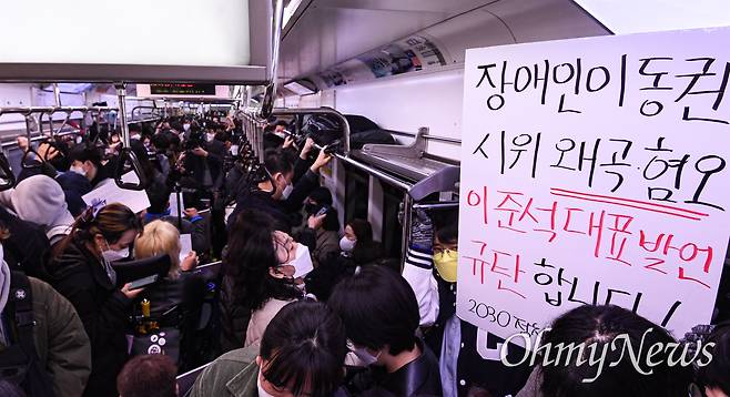 그런데 지난 3월 27일 이준석 국민의힘 대표는 자신의 SNS에 전장연의 시위 방식을 두고 "불특정한 최대 다수의 불편이 특별한 우리에 대한 관심"이라며 비난했다. "최대 다수의 불편"에 의존하는 사회는 문명사회가 아니니 전장연에게 "불특정 다수의 불편을 볼모 삼는 시위"를 조건 없이 중단할 것을 요구했다. 이준석 대표의 SNS를 보고 잊었던 화가 다시 가시처럼 가슴을 찔렀다.