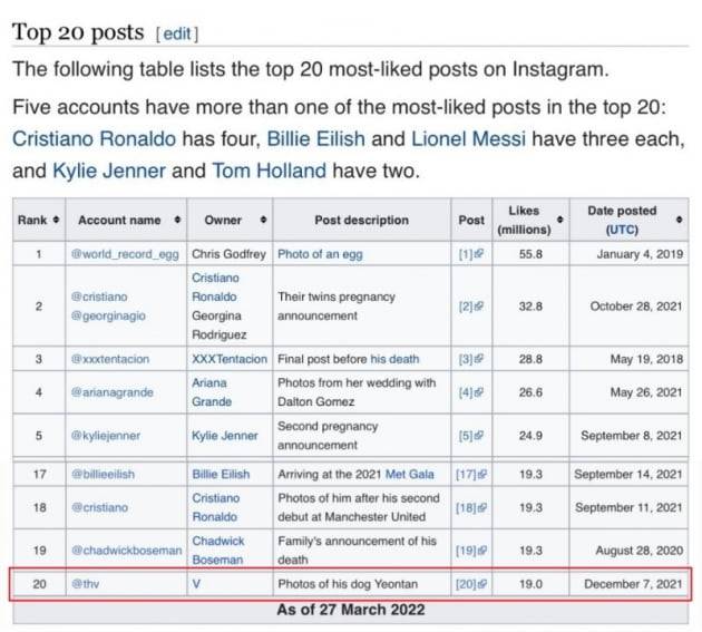 해당 게시물은 지난해 12월 7일 뷔가 인스타그램에 게재한 반려견 연탄의 사진으로, 이 사진은 이미 아시아 셀럽 최초로 1900만 ‘좋아요’를 받은 바 있다.