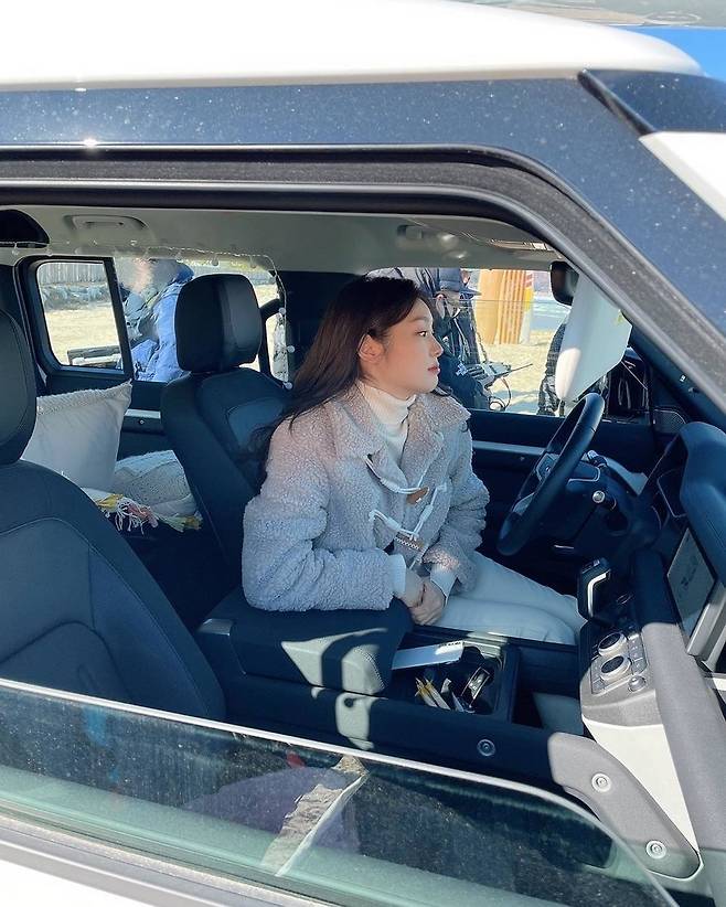 사진 속 김연아는 광고 촬영장으로 보이는 현장에서 차 안에 앉아 휴식을 취하고 있다.
