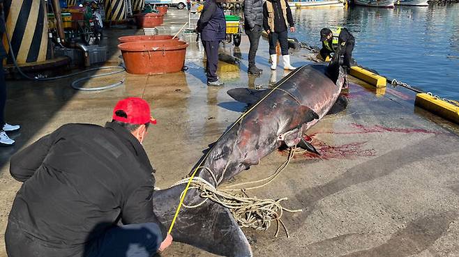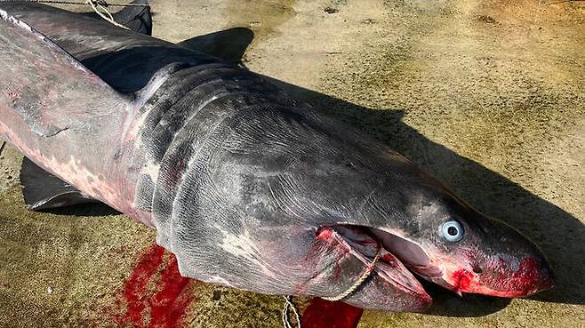 강원도 강릉시 주문진 앞바다에서 돌묵상어가 그물에 걸려 죽은 채 발견됐습니다.