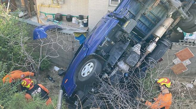 경찰은 화물차가 보행로 가드레일을 들이받고 주택 담벼락 옆에 뒤집힌 것으로 보고 있습니다.