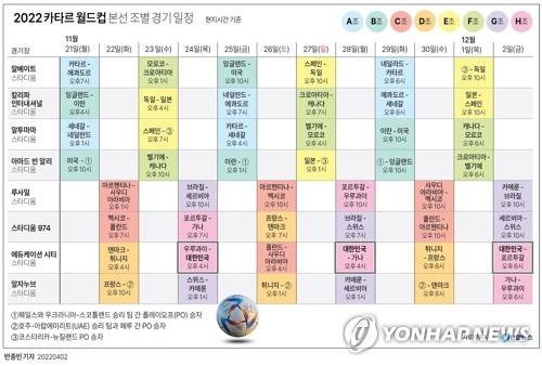 국제축구연맹(FIFA)은 2일(한국시간) 카타르 도하에서 월드컵 본선 조 추첨을 진행한 데 이어 경기별 시작 시간과 장소를 확정, 발표했다.