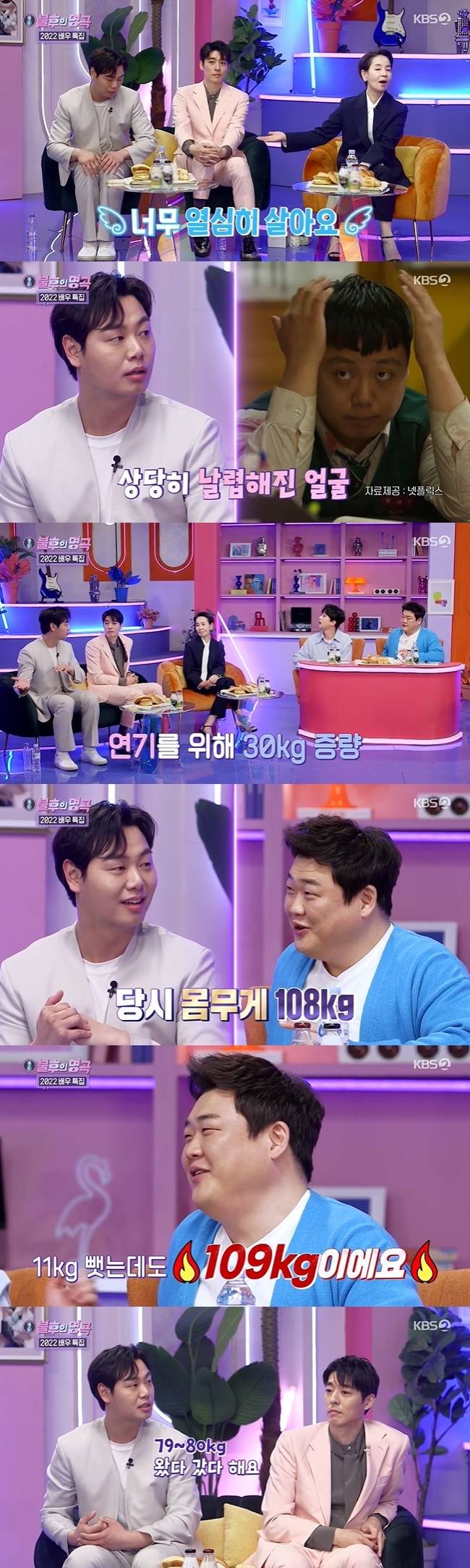 임재혁은 “배역을 맡고 30kg 정도 찌웠다. 당시 108kg 정도였다”라고 말했다. 김준현은 “30kg 찌웠는데 108kg냐. 저 11kg 뺐는데도 109kg이다”라고 말해 웃음을 안겼다. 현재 상태를 묻자 임재혁은 “지금은 79~80kg 왔다 갔다 한다. 27kg 정도 감량했다”라고 답했다.