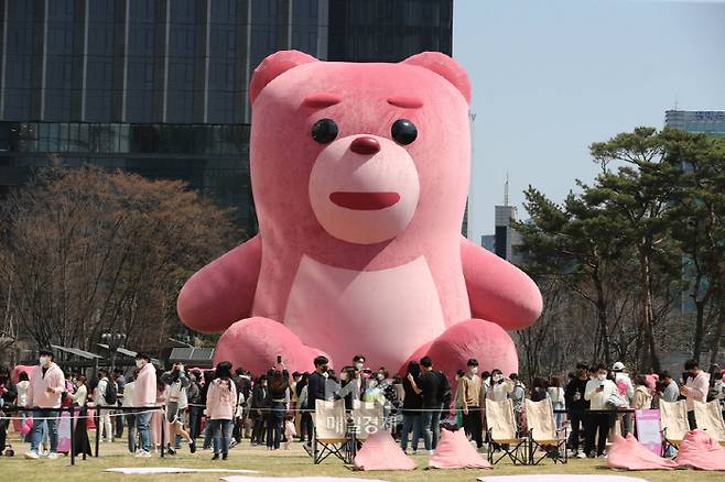 3일 서울 송파구 서울롯데월드타워 광장에서 시민들이 15m 크기의 대형 '벨리곰' 인형을 구경하고 있다. 롯데홈쇼핑은 롯데월드타워 오픈 5주년을 맞아 1일부터 메인 광장에 15m 크기의 특대형 벨리곰을 전시하고 있다. 벨리곰은 롯데홈쇼핑이 2018년 MZ세대 직원을 대상으로 진행한 사내 벤처 프로그램을 통해 탄생한 캐릭터로, 다양한 소셜미디어에서 인기를 얻고 있다. 벨리곰 전시는 이달 17일까지 계속되며, 관람객과 함께하는 몰래카메라 등 다양한 행사도 진행될 예정이다. 2022. 4. 3.