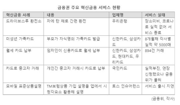 하지만 일부 혁신금융서비스의 경우 해당 기업들이 신규 사업아이디어를 비현실적으로 제안하거나, 사업성이 낮은 탓에 시장에 제대로 안착하지 못하고 있는 것이다. '무늬만 혁신금융'이라는 지적이 나오는 이유다.