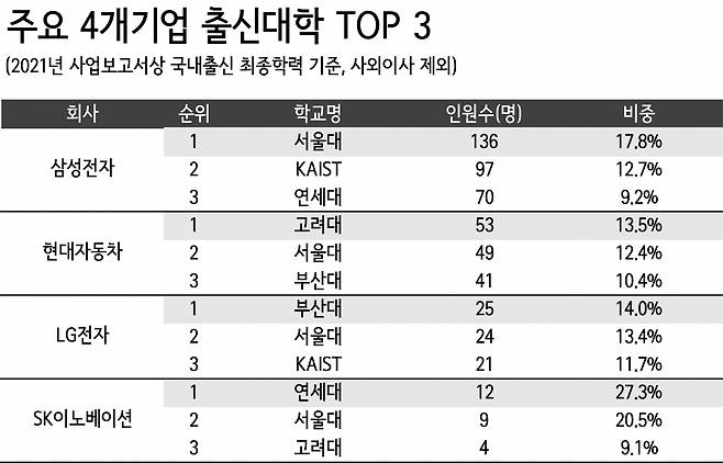 국내 대학 중 가장 많은 임원을 배출한 학교는 서울대로, 총 136명(국내 중 17.8%)이 이 학교를 다녔다. 국내 출신 5명 중 1명 가까이가 서울대를 졸업한 셈이다. ‘초격차’를 기치로 한 삼성의 일등주의가 타 기업에 비해 서울대 선호도를 높였다는 관측이다.