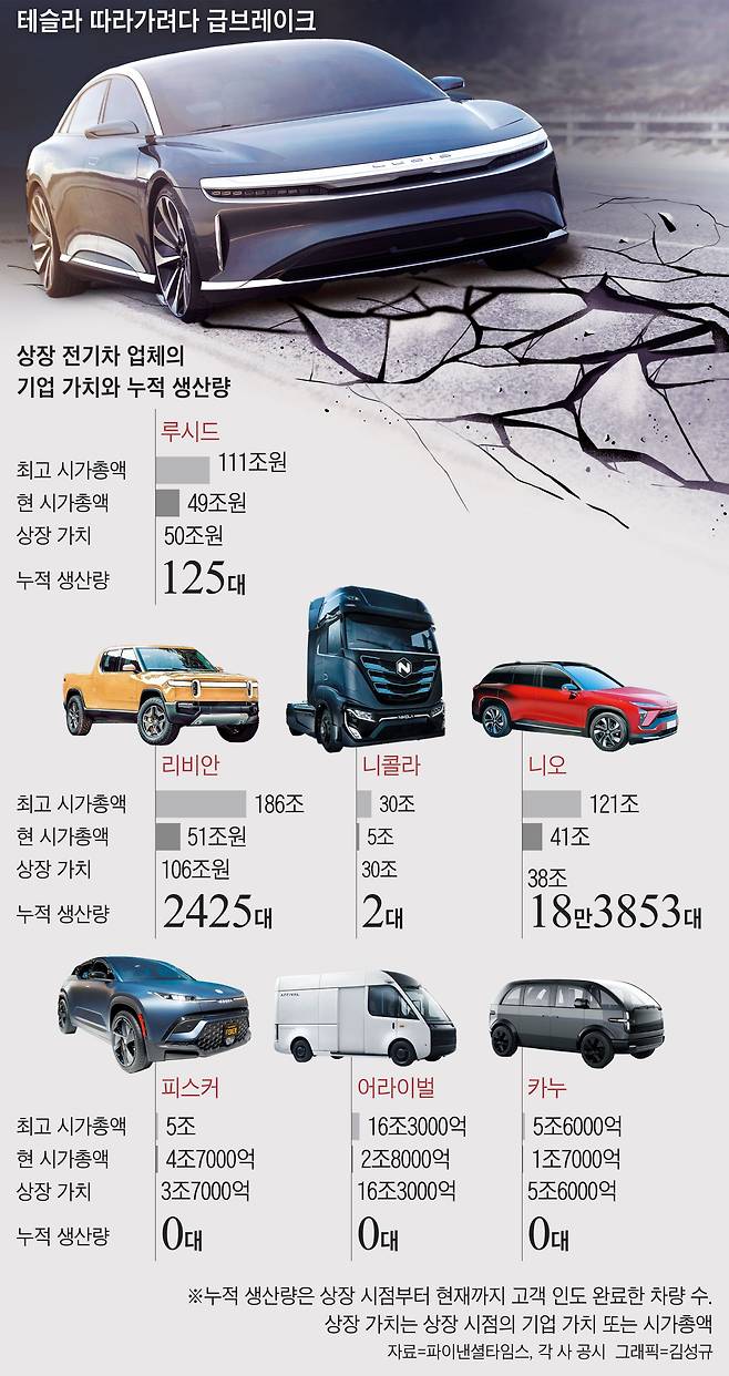 4일 각사의 공시자료와 영국 파이낸셜타임스(FT)의 분석을 종합한 결과, 상장 전기차 업체 7곳 중 6곳이 상장 이후 고객 인도 차량 1만 대가 채 안 되는 것으로 나타났다. 시가총액 49조인 전기차 업체 루시드는 여태 고객에게 125대의 차량을 인도 완료했고, 피스커·어라이벌·카누는 ‘0대’다. 유일하게 중국기업 니오만 18만대가 넘는 차량을 고객에게 인도했다. 이들 회사는 최근 부품 공급난으로 더 어려운 시기를 겪고 있다. 글로벌투자은행 크레디트스위스는 이런 신생 전기차 업체들을 ‘콘셉트 주식’이라고 냉혹하게 평가했다. 전기차 사업에 대한 콘셉트만 있고 알맹이가 없다는 뜻이다.