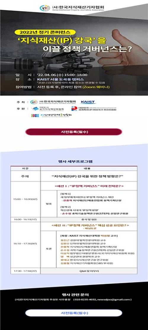 KAIST 지식재산대학원 박성필 교수가 진행하는 이날 컨퍼런스에서는 전종학 지식단체총연합회 정책기획단장이 '새 정부에 바라는 지식재산정책 거버넌스'를, 과학기술정책연구권 손수정 박사가 '혁신경제시대의 지식재산정책 방향'을 제안합니다.