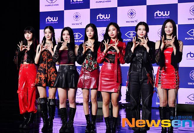 이날 쇼케이스에 참석한 퍼플키스 (박지은, 나고은, 도시, 이레, 유키, 채인, 수안)가 포즈를 취하고 있다.