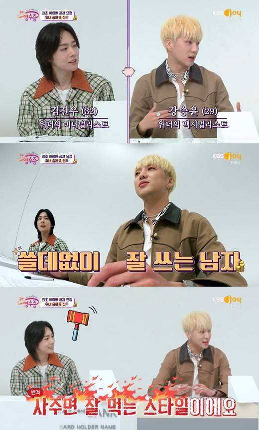 6일 오후 방송된 케이블채널 KBS Joy 예능 프로그램 '국민 영수증' 마지막회에서는 그룹 위너 멤버 강승윤, 김진우가 게스트로 출연했다.