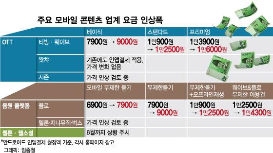 티빙과 웨이브는 안드로이드 버전 앱에 구글 인앱결제 시스템을 전면 도입하고 이용권 가격을 인상했다. △베이직 이용권 월 7900원→9000원 △스탠다드는 1만900원→1만2500원 △프리미엄 1만3900원→1만6000원으로 14~15% 올랐다. KT의 OTT 서비스 시즌(seezn) 역시 '상품 가격이 변경될 수 있다'며 가격 인상을 시사했다.