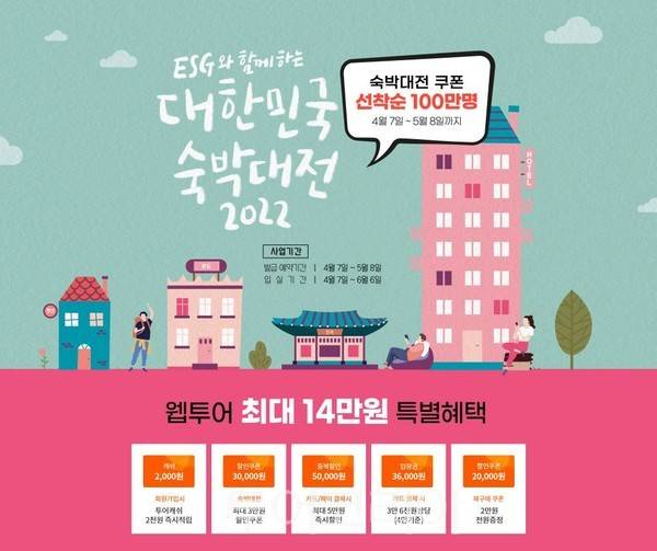 인터파크투어가 'ESG와 함께하는 2022 대한민국 숙박대전'을 오픈했다. 인터파크투어는 이번 프로모션을 통해 오늘부터 오는 5월 8일까지 매일 오전 10시부터 선착순으로 할인쿠폰을 발급해준다. 인터파크투어 단독 혜택으로 총 2천만원 이상 규모의 중복 할인쿠폰과 경품을 마련했다. 카드 및 간편결제 이용 시 최대 5만원 중복할인 혜택을 제공한다. 아울러 숙박대전 참여 고객을 대상으로 추첨을 통해 전국 인기 호텔 및 리조트 숙박권도 지급한다.