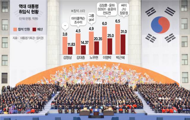 갈수록 화려해지는 취임식에 구두로나마 제동을 건 사람은 이명박 전 대통령이었다. 이 전 대통령은 “검소하면서 인상적이게 하라”고 지시했다. 그럼에도 취임준비위원회는 방점을 ‘인상적’이라는 단어에 뒀다. 가수 김장훈과 윤하, 그룹 SS501이 공연했고 영화배우 송윤아·전도연까지 참석했다. 사회도 방송인 김제동이 봤다. 예산(25억 원)도, 참석 인원(6만 명)도 역대 대통령 중에 가장 화려했다. 박근혜 전 대통령도 ‘강남스타일’로 세계적 스타가 된 가수 싸이를 불렀고 31억 원의 예산을 써 6만 5000명이 모였다.