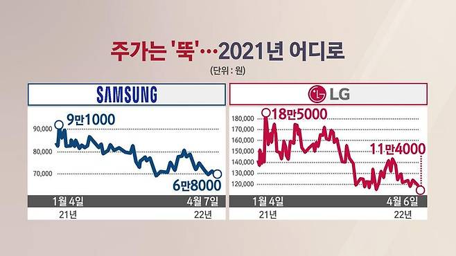 삼성전자는 지난해 초 한창 좋을 때 주가 9만 원을 넘기며 기대를 모았는데, 지금은 7거래일 연속 6만 원대를 기록했고요.