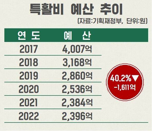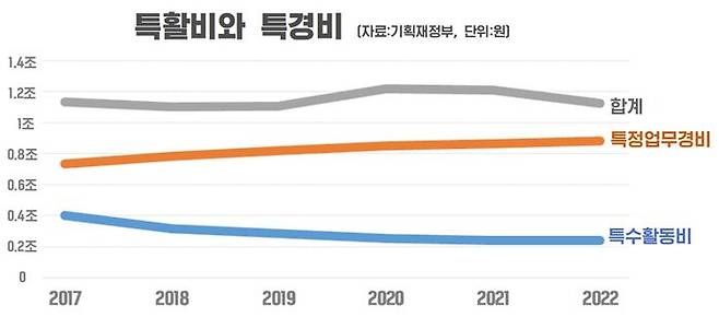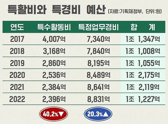 2017년 기준, 특활비 예산은 4,007억 원이었는데 특경비 예산은 7,340억 원이었습니다. 2022년 예산 대비 특활비는 40.2% 줄어들고, 특경비는 20.3% 늘었습니다.