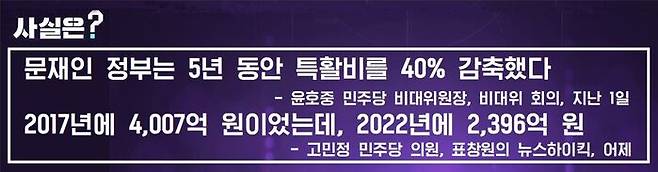 오늘의 팩트체크 사실은, "정부 특수활동비 40% 줄었다"에 대한 판정은 "안타깝지만, 사실"로 하겠습니다.