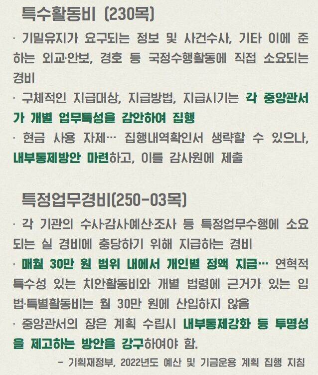 먼저, 특활비와 특경비의 차이를 알아봤습니다. 기획재정부가 작성한 2022년도 예산 및 기금운용 계획 집행 지침에는 각 부처가 예산을 어떻게 써야하는지 일종의 가이드라인이 적혀 있습니다. 문서에 있는 주요 문장을 그대로 실었습니다.