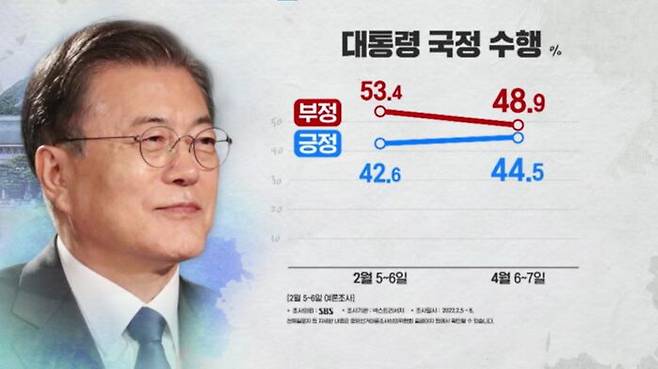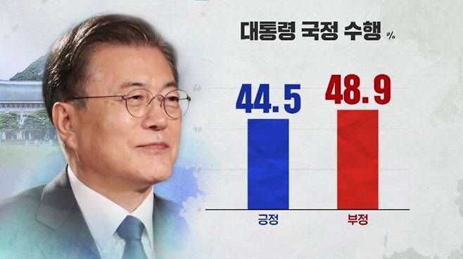 퇴임을 앞둔 문재인 대통령의 국정운영 지지도는 잘하고 있다 44.5%, 잘 못하고 있다 48.9%로 나타났습니다.