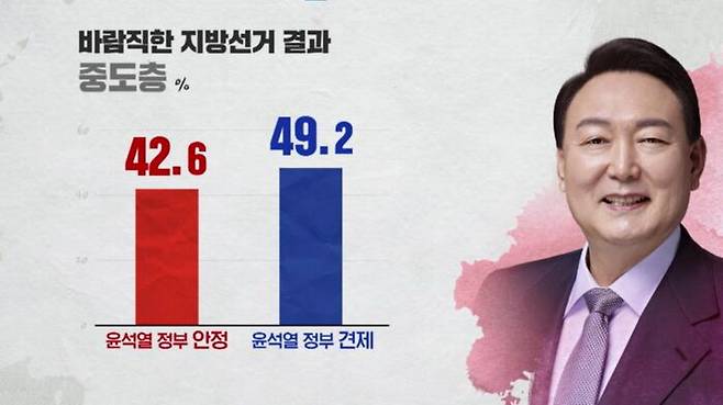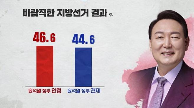 윤석열 정부 안정을 위한 여당 후보 지지 46.6%, 윤석열 정부 견제를 위한 야당 후보 지지 44.6%로 선호 정당 후보 응답과 마찬가지로 오차범위 안에서 팽팽했습니다.