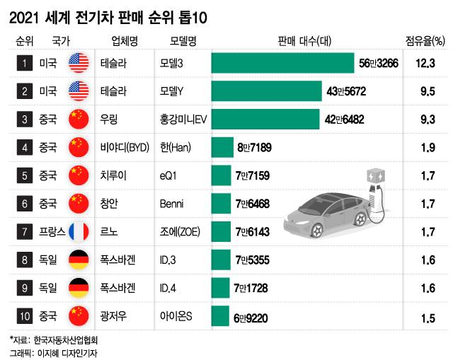 1위는 미국 테슬라의 '모델3'로 총 56만3266대(12.3%)가 팔렸다. 2위는 미국 테슬라의 '모델Y'로 43만5672대(9.5%)가 판매됐다. 3위 중국 우링의 '훙강미니EV'는 42만6482대(9.3%)가 팔렸다.