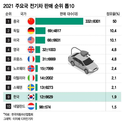 9일 한국자동차산업협회에 따르면 지난해 주요국 전기차 판매율 순위에서 중국이 1위를 차지했다. 작년 한해 동안 세계에서 팔린 전기차 수는 약 666만대로, 이 가운데 절반인 332만8301대(50%)가 중국에서 판매됐다. 2위는 69만4817대(10.4%)를 판 독일, 3위는 66만9931대(10.1%)를 판 미국이 차지했다.