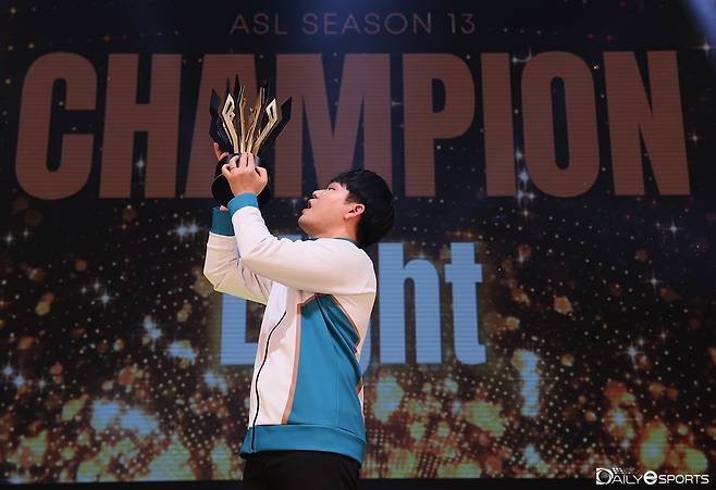 ASL 첫 우승을 차지한 이재호가 챔피언 세리너미를 펼치다가 트로피를 바라봤다.