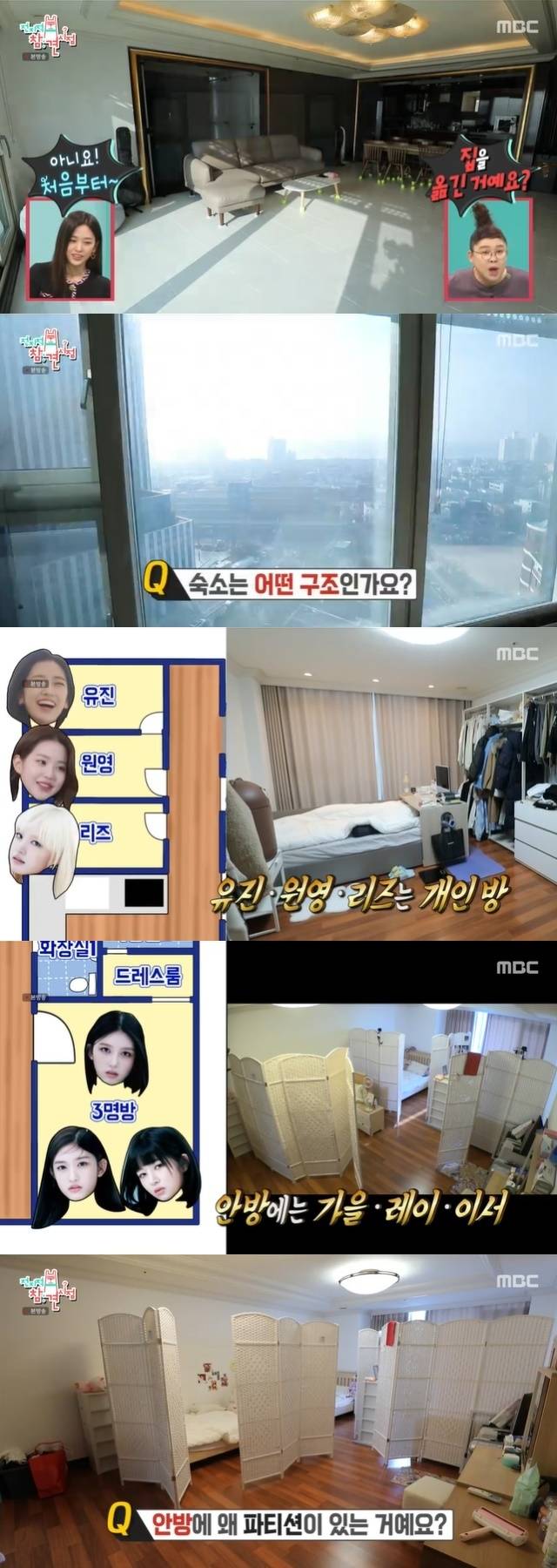 숙소 구조는 들어가면 오른쪽부터 안유진, 장원영, 리즈가 독방을 쓰고 있고, 안안방은 가을, 레이, 이서 3명이 함께 쓰고 있었다. 안방에서는 파티션이 보였는데 매니저는 "방이 커서 파티션을 쳐주면 작은 방 3개가 나올 사이즈라 각자 공간을 위해 설치했다"고 설명했다.