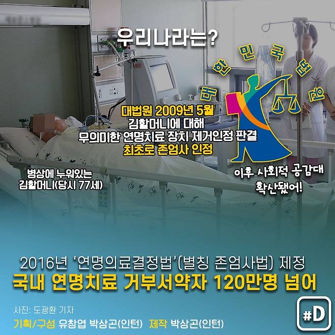 이어 2016년 1월 '호스피스·완화의료 및 임종단계에 있는 환자의 연명의료결정에 관한 법률'(약칭 '연명의료결정법')이 제정돼 2018년 2월 시행에 들어갔죠.