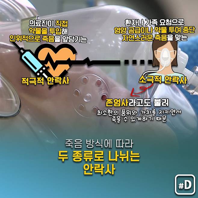 일반적으로 환자 요청에 따라 의료진이 직접 약물을 투입하는 방법 등으로 인위적으로 죽음을 앞당기는 '적극적 안락사'와 환자나 가족 요청에 따라 생명유지에 필수적인 영양 공급이나 약물 투여 등을 중단함으로써 환자가 죽음에 이르게 되는 것은 '소극적 안락사'가 그것입니다.