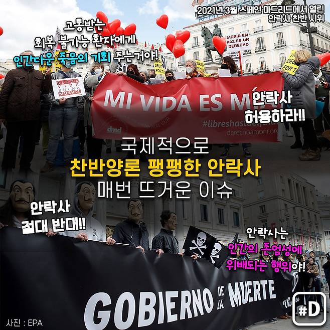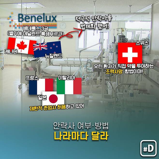 이런 찬반 논란은 다른 국가들에서도 있었는데요. 나라마다 서로 다른 사정에 따라 안락사 허용 여부와 방법 등이 갈리고 있습니다.