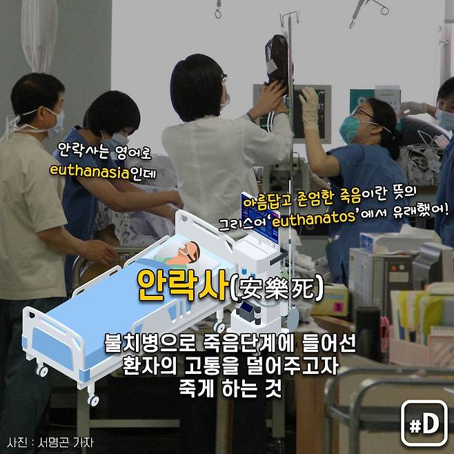 '존엄사'라는 용어도 있는데요. 존엄사는 인간으로서 지녀야 할 최소한의 품위와 가치를 지키면서 죽을 수 있게 하는 행위를 말하는데, '소극적 안락사'와 동일한 의미로 통용됩니다.