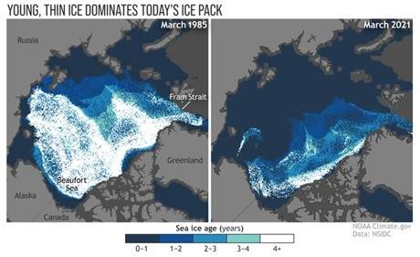 | ▲ 1985년과 2021년에 관측된 북극의 얼음 면적과 나이 비교 자료. 형성된 지 4년 이상된 두꺼운 얼음이 1985년 30.6%에서 2021년 3.5%로 크게 줄어 현재 북극의 얼음은 1년 미만인 얇은 얼음으로 되어있다. |