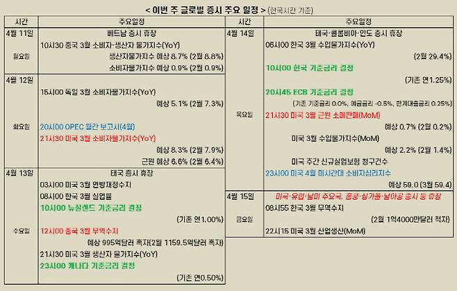15일에는 부활절을 기념해 미국과 유럽, 남미 주요국과 홍콩·싱가포르 등에서 증시가 휴장한다.
