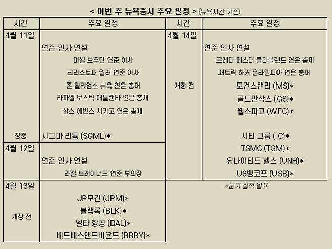 한편 같은 날 뉴욕증시에서는 모건스탠리와 골드만삭스 등 월가 주요 은행을 비롯해 유나이티드 헬스, 대만 TSMC 가 분기 실적을 공개한다.