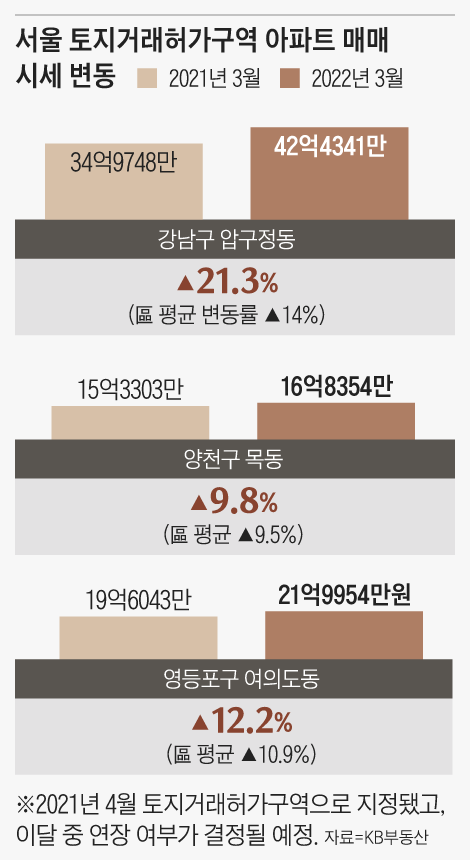 10일 KB부동산에 따르면, 압구정동 아파트 평균 시세는 토지거래허가구역으로 지정되기 전인 작년 3월 34억9748만원에서 지난달 42억4341만원으로 21.3% 올랐다. 같은 기간 강남구 평균 상승률 14%를 훌쩍 웃돌았다. 압구정동과 같은 날 토지거래허가구역으로 지정된 양천구 목동(9.8%)과 영등포구 여의도동(12.2%)의 아파트 시세도 각각 양천구(9.5%)와 영등포구(10.9%) 평균과 비슷하게 올랐다.