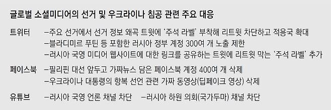 전문가들은 주로 혐오와 차별 표현의 확산 방지에 힘을 쏟아온 소셜미디어들이 선거나 국가 간 충돌 같은 거대 이슈에도 대응해야 하는 과제에 직면했다고 지적한다. 심영섭 경희사이버대 미디어영상홍보학과 교수는 “왜곡 정보를 막으라는 여러 이해당사자의 요구가 갈수록 강해지겠지만 표현의 자유와 개방성을 강조하는 글로벌 플랫폼이 적극적으로 정보를 차단하기는 쉽지 않은 측면도 있다”며 “하지만 이용자의 집단지성 등을 적절히 활용해 명백한 허위사실의 유통을 막는 노력이 이어질 것”이라고 말했다.