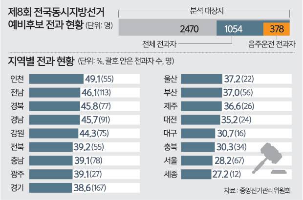 지역별로는 인천시가 등록 예비후보 중 전과자 비율이 49.1%로 가장 높았다. 이어 △전남 46.1% △경북 45.8% △경남 45.7% △강원 44.3% 순이다. 전과자 비율이 가장 낮은 지역은 세종시로 27.2%이었다.