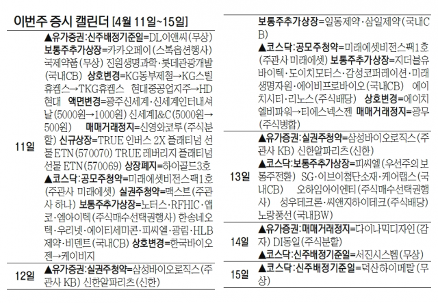14일에는 다이나믹디자인(145210)이 감자로, DI동일(001530)이 주식분할로 매매거래가 중단된다. 서진시스템(178320)의 무상증자 신주배정 기준일이다.