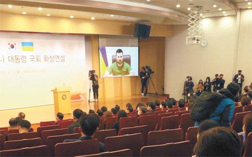젤렌스키 대통령은 “글로벌 기업들이 러시아에서 철수하지 않고 세금을 내고 러시아 경제를 지지한다면 러시아는 세계와 타협점을 찾으려고 할 것”이라며 “기업들이 러시아와의 협력을 완전히 중단해야 한다”고 했다. 러시아에서 사업을 계속하는 한국 기업을 염두에 둔 것이다. 또 “러시아는 우크라이나 민족과 문화, 언어를 없애려 한다. 점령지에서 민족운동가와 국어 선생님들부터 찾아내 학살하고 있다”며 일제강점기 민족문화 말살 정책을 떠올리게 하는 발언도 했다. 통역을 맡은 올라나 쉐겔 한국외국어대 우크라이나어과 교수는 연설 막바지 울먹였다.