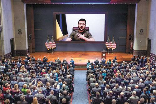 | 젤렌스키 화상연설… 꽉찬 美 지난달 16일 젤렌스키 대통령의 미국 상·하원 합동 화상연설 때는 의원들로 의회 강당이 가득 찼다. AP 뉴시스 |