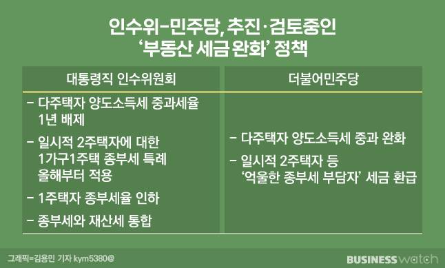 인수위는 1주택자 종부세율 인하, 올해부터 일시적 2주택자에 대한 1가구1주택 종부세 특례 적용, 종부세와 재산세 통합 등을 검토 중인 것으로 전해진다.